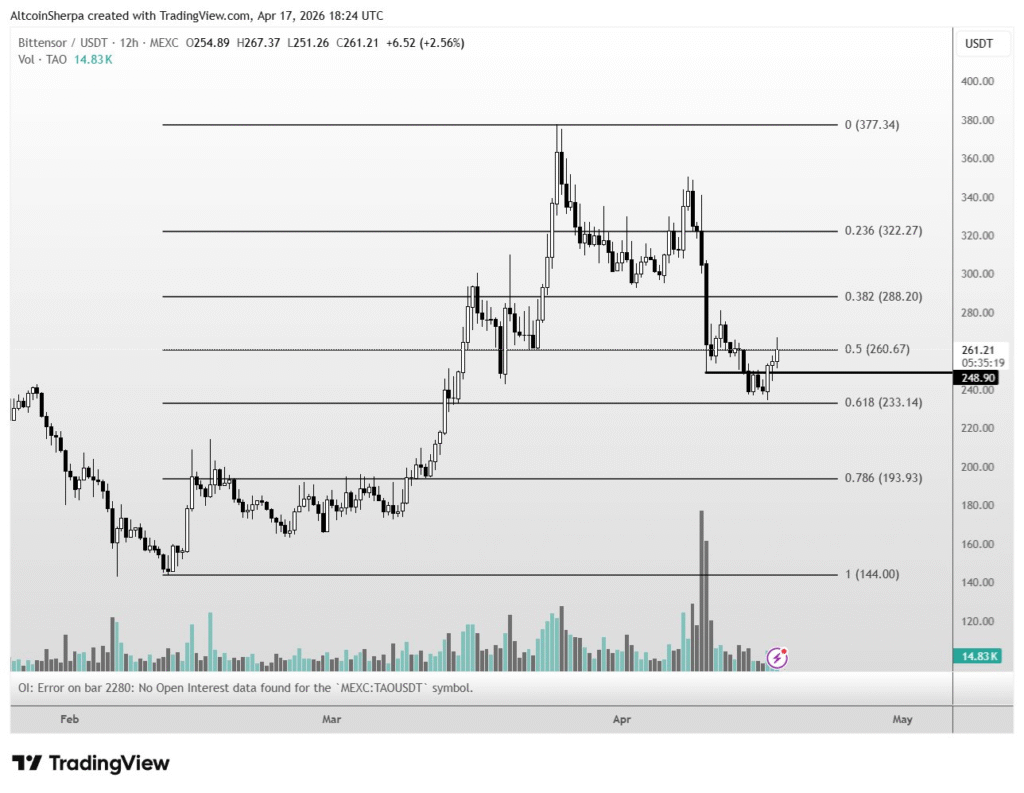 TAO自243美元低点反弹,成功触及0.618回撤位,该位置被证实具备显著承接力。根据Altcoin Sherpa分析,12小时图显示价格在此区域形成明确反转形态,预示潜在短期修复行情。若多头能延续攻势,目标直指300美元区间。