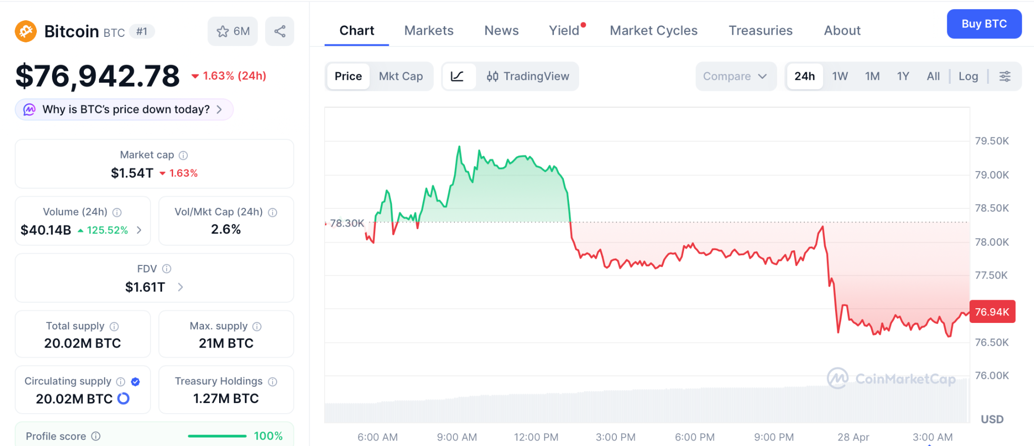 根据CoinMarketCap数据,当前比特币交易价为76,942美元,自4月初低点68,000美元反弹以来,已重回3月中旬以来最强支撑区域。尽管在亚洲时段尝试冲击79,500美元未果,最终小幅回落约1%。以太坊则维持在2,315美元附近,恐惧与贪婪指数为33,仍处谨慎情绪区间。