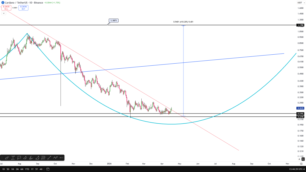 当前卡尔达诺(ADA)交易价格为0.26美元,日线小幅攀升,与历史高点3.10美元相距甚远。多数投资者已将其视为难以翻身的滞涨资产,然而一位独立分析师提出截然不同的观点。他通过两张图表——日线与周线——揭示出极具潜力的长期结构,并明确指出6.30美元为合理上行目标。关键突破已在日线层面显现,耐心持有者或将迎来回报。