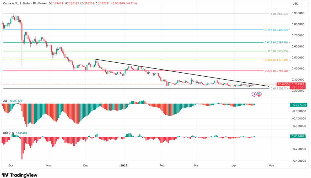从长期图表观察,卡尔达诺仍被压制在下降趋势线之下,尽管近期反弹明显,但未能收复前期高点以确认趋势逆转。0.22美元支撑已多次测试,其有效性正在减弱;而0.48美元与0.56美元的阻力带依然构成显著压制,限制上行空间。
