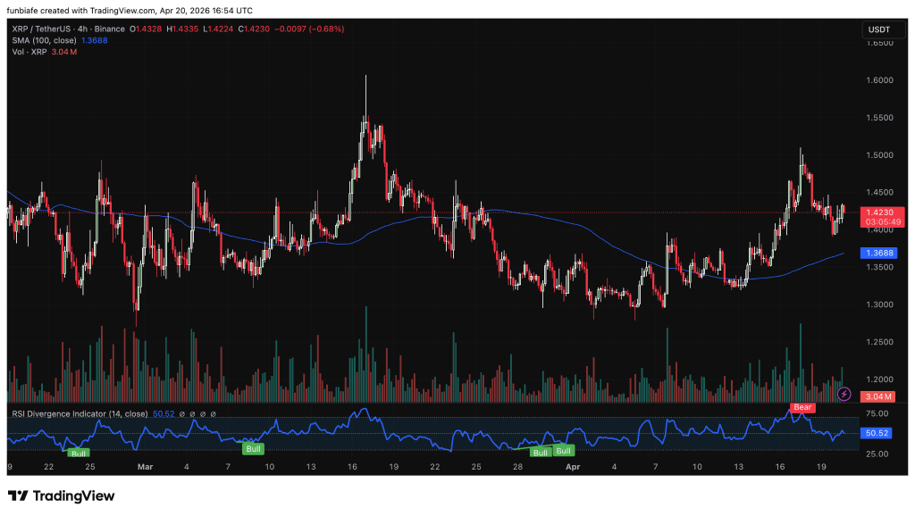从4小时图分析,XRP维持在1.3688美元的100周期均线之上,阻力区间分别为1.45美元、1.50美元与1.55美元,支撑位依次为1.40美元、1.36美元及1.35美元。相对强弱指数为50.52,呈中性偏强,且多个看涨背离信号浮现——价格创出新低,但动量指标却守住更高低点,暗示潜在买盘蓄力。