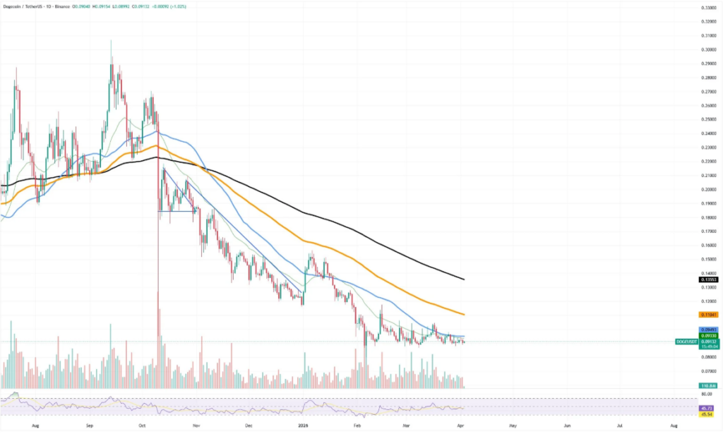 技术面显示,狗狗币仍位于关键移动平均线之下,均线系统延续下行趋势,整体结构仍指向早期跌势延续,尚未确认反转信号。