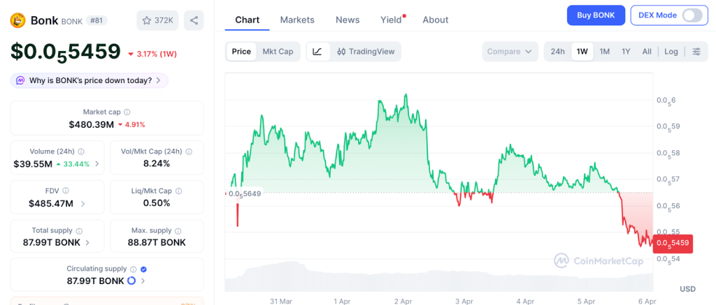 据CoinMarketCap数据,当前BONK价格为0.0000054美元,较2024年11月高点下跌90%。截至4月的预测显示,其波动区间预计介于0.0000050至0.0000080美元之间,相对强弱指数(RSI)约为46,红盘日卖压仍占主导。