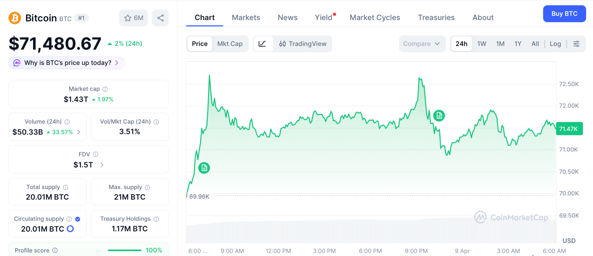 比特币反弹至71,480美元,上行空间受限于阻力位