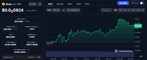 当前邦克币($BONK)报价为0.000005924美元,市值约5.2136亿美元,过去24小时交易额达3922万美元。该币种价格录得3.33%涨幅,交易量微降4.13%,整体呈现小幅上扬态势,显示市场参与度保持稳定。