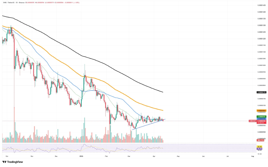 柴犬币价格跌破长期维持的上升趋势线,标志着此前数周温和复苏的结束。这一技术性破位打破了自三月初以来逐步抬高的低点格局,反映出市场情绪由修复转为持续承压。
