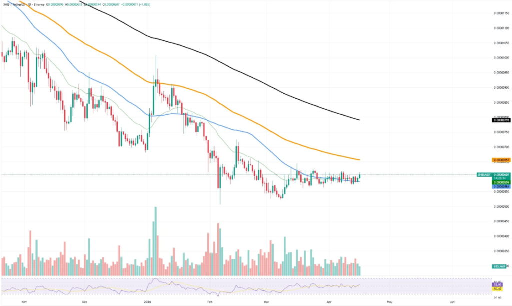 相对强弱指数已回升至中位以上,近期蜡烛图收盘表现优于前期,反映买方力量有所增强。然而,长期均线构成的阻力区域仍压制上涨空间。若能突破0.0000065美元至0.0000067美元区间,或可打开进一步上行通道。