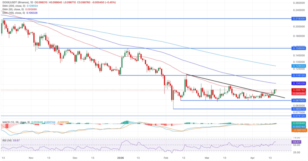 狗狗币价格承压于0.10美元关口,多头仍具韧性