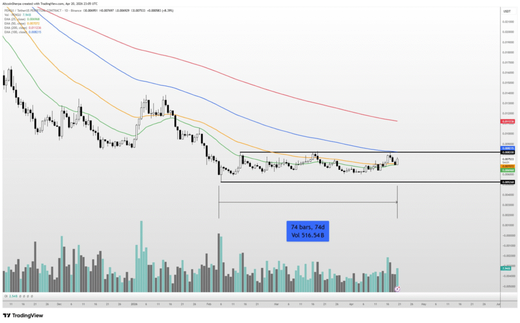 PENGU已连续74天以上处于窄幅波动状态,形成明确的整理格局。根据分析师Altcoin Sherpa分析,此阶段有助于日线级别均线体系的重构与稳定。目前价格位于约0.00755美元水平,日内上涨近7%,在币安现货市场中领跑迷因币板块,但仍未触及历史高点。