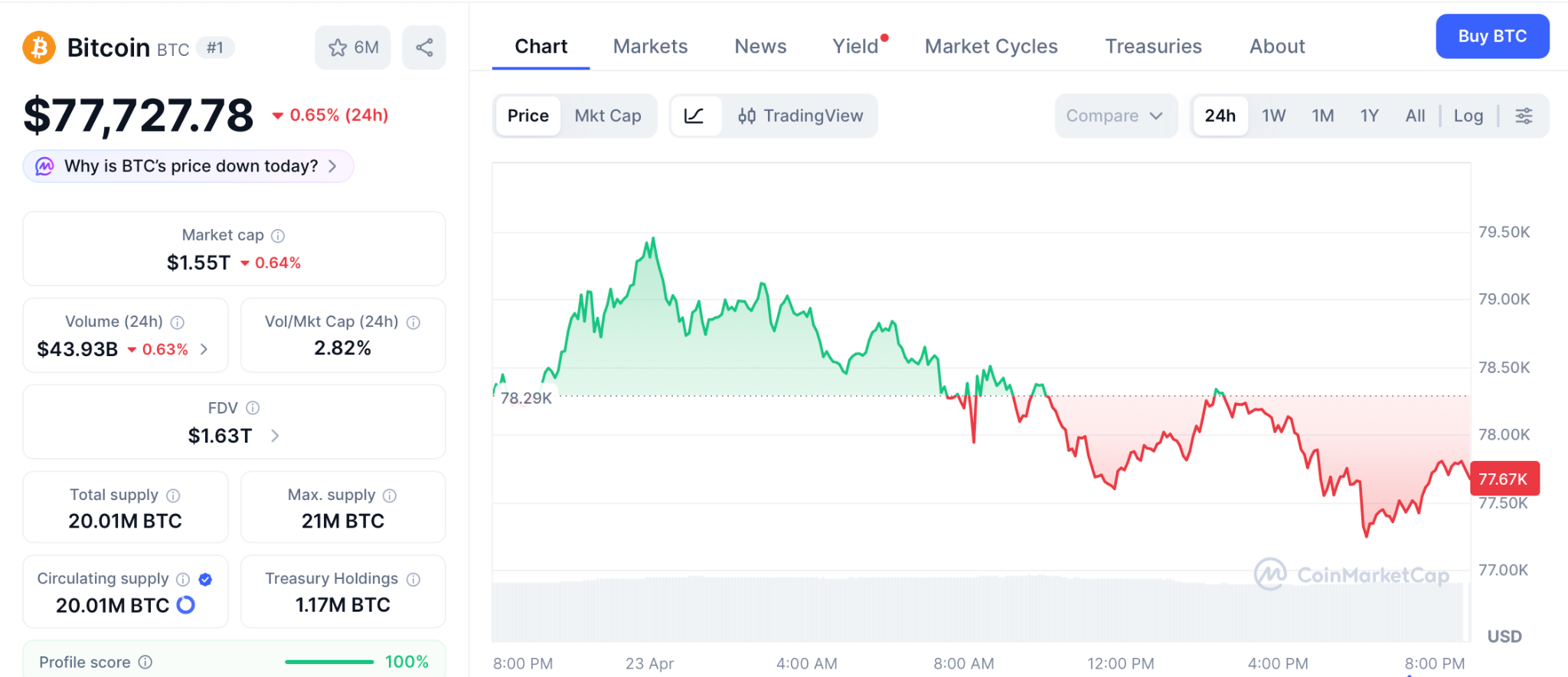 根据CoinMarketCap最新数据,4月23日比特币交易价为77,727美元,此前一度触及79,388美元的11周高点后进入盘整阶段。短期支撑位于75,000美元附近,阻力位在80,000美元区间。分析师预计,若停火延续至5月,价格有望测试80,000至85,000美元区间。