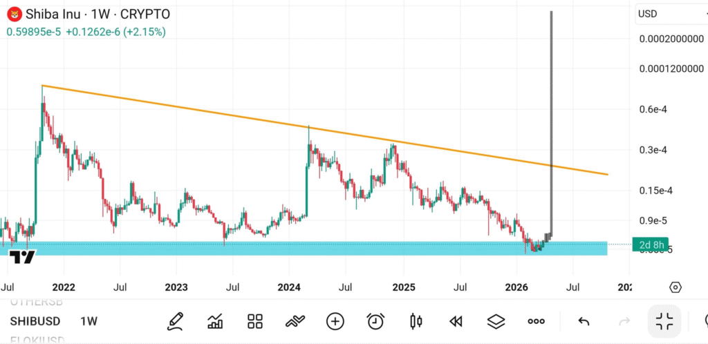 在周线图上,柴犬币持续在收窄区间内震荡,形成典型的压缩形态。据XRP Captain指出,此类技术结构往往伴随剧烈的方向性突破。自2022年确立的下行趋势线仍是当前主要压力源。