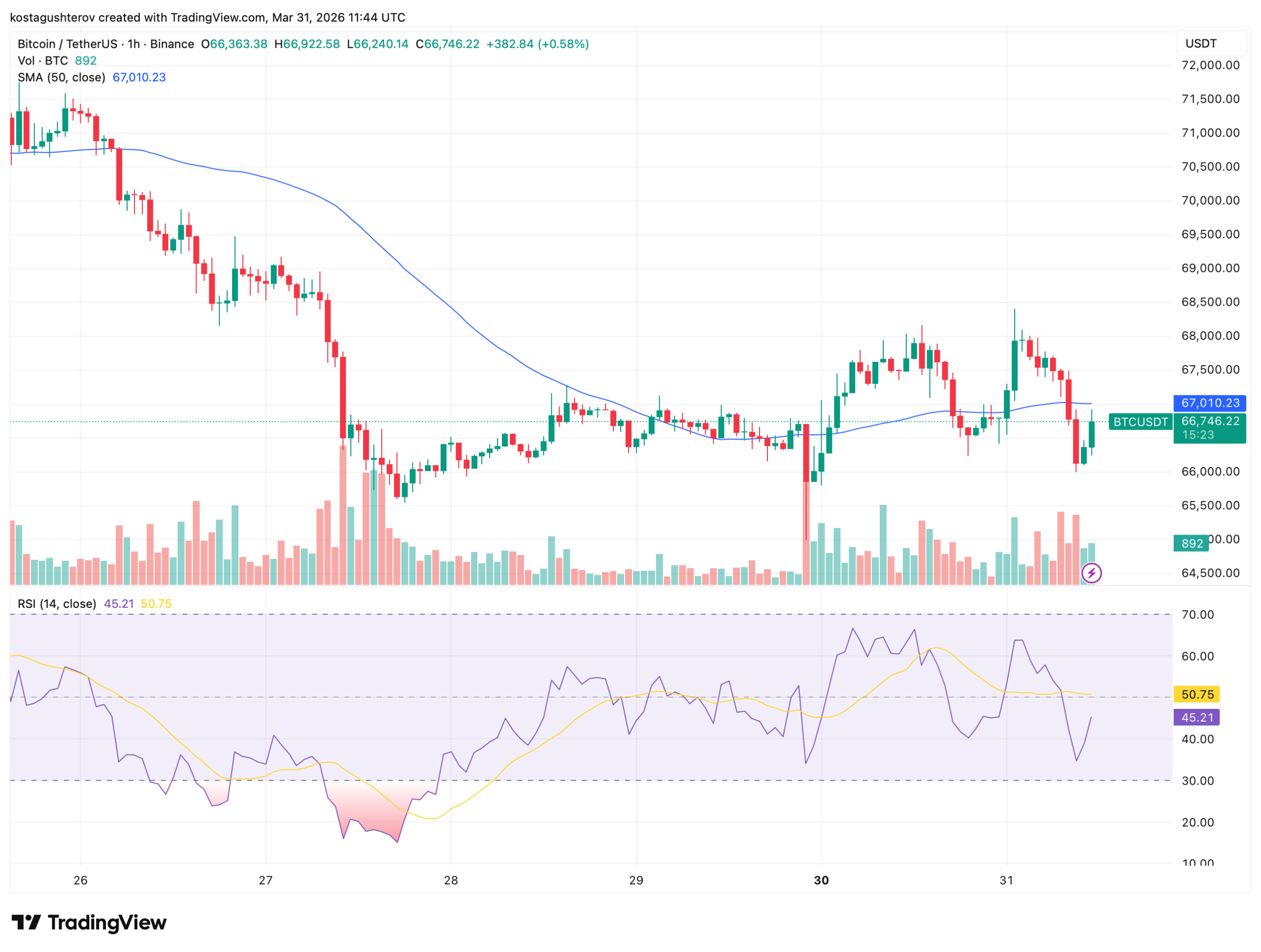 TradingView一小时图表显示,比特币于3月26日在71,000美元上方开盘,次日遭遇大幅抛售,一度跌至65,000美元附近,相对强弱指数逼近20的超卖水平。此后价格反弹,3月30日回升至68,500美元,但3月31日再度走弱,最低触及66,000美元,最终收于66,746美元。