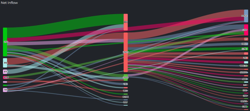 截至28日上午10时30分,过去五小时内共约265万美元资金流入加密市场,覆盖以太坊、狗狗币等多个主流与新兴代币。同时,巴西雷亚尔、土耳其里拉及韩元等非美主要法币也出现小额流入迹象,显示全球流动性正在重新配置。