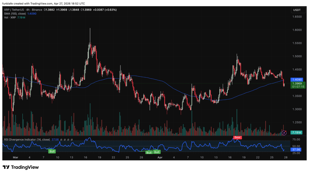 自四月初触及1.60美元上方高点后,XRP价格进入持续回调阶段,现运行于1.35至1.40美元区间,呈现阶段性企稳迹象。尽管买方力量初步显现,但整体市场信心尚未全面恢复,交易活跃度维持在温和水平。