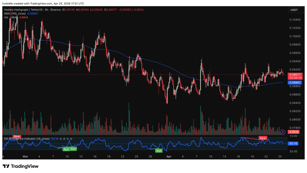 技术面数据显示,HBAR现价为0.09077美元,日内跌幅0.66%。价格已连续多周呈现递减高点与低点的震荡格局,下方关键支撑位于0.090美元,次级支撑在0.088美元与0.085美元区间。上方阻力依次为0.092美元、0.094美元和0.096美元。成交量仅为499万HBAR,表明尚未出现恐慌性抛售;相对强弱指数(RSI)接近45,处于中性偏空区域。整体呈现于区间下沿整理态势。