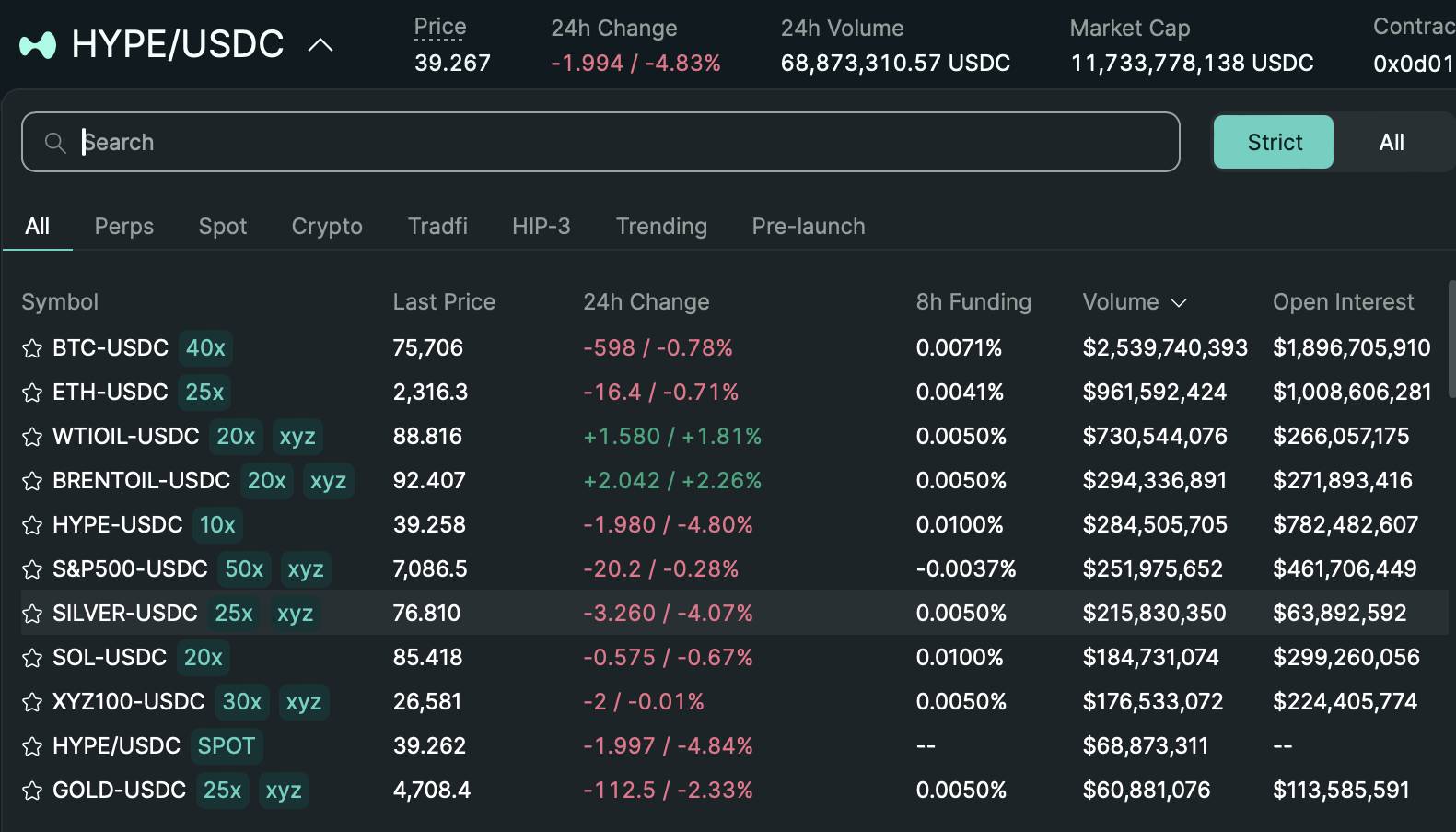 Hyperliquid平台同样推动跨市场扩展。数据显示,与原油、标普500指数及白银挂钩的永续合约已成为其最活跃交易品类之一,日均交易额已与比特币、以太坊等主流币种持平。