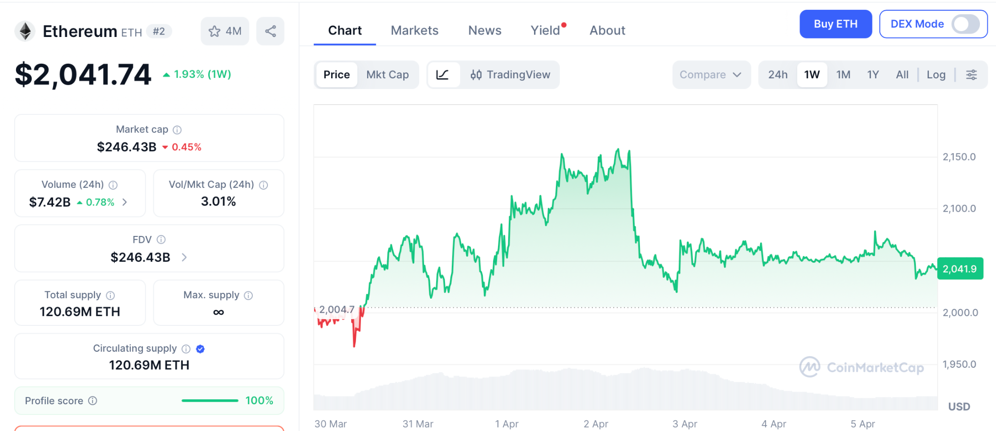 根据CoinMarketCap数据,以太坊当前交易价为2,041美元,虽在宏观上涨中表现疲软,仍守住2,000美元关键支撑。渣打银行维持其年底7,500美元目标,意味着九个月内实现约3.6倍增值,对长期配置者具备吸引力。然而,随着市值逼近万亿美元,此类高倍回报已难再现。