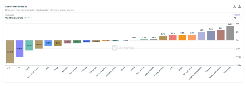 当前加密市场正经历新一轮资金重分配,资金流向呈现明显的结构性特征:主流资本持续注入隐私保护技术与以太坊生态等底层支撑体系,与此同时,现实世界资产(RWA)及人工智能相关项目则面临阶段性抛压。