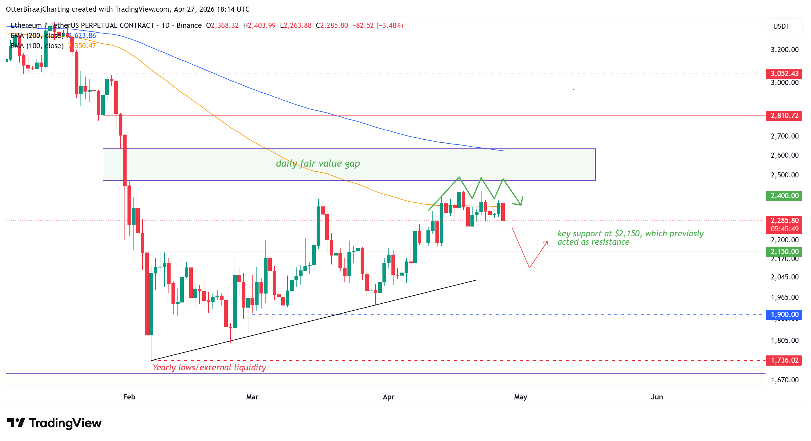 过去两周内,以太坊已连续四次未能突破2400美元关口,在日线图上形成明显的三重顶形态。每次上探该位置后动能均出现衰减,表明卖方在该价位持续吸收抛压。位于2350美元附近的100日指数移动均线(EMA)持续构成动态阻力,价格在日线图上始终未能站稳该均线上方,致使反弹尝试屡次夭折。